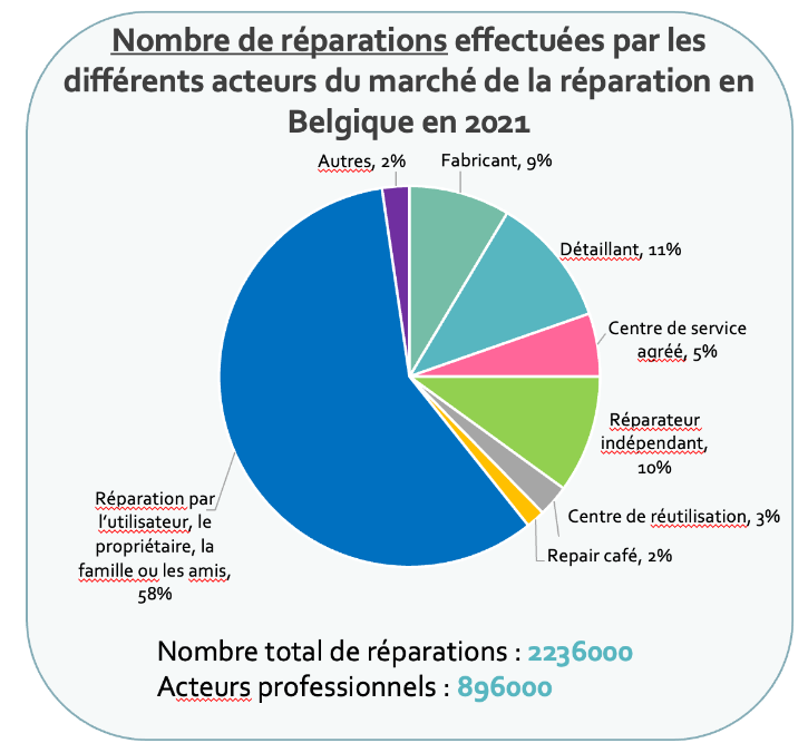 Il ressort que dans la plupart des cas, nous effectuons nous-mêmes les petites réparations d’appareils électro. Sur les 2,2 millions d’appareils réparés en 2021, 58 % ont été réparés par leur propriétaire ou avec l’aide d’un proche. Les Repair Cafés, qui fonctionnent avec des bénévoles, prennent en charge 2 % des appareils. Les réparateurs indépendants, fabricants et détaillants représentent chacun 10 % des réparations. Ces deux dernières catégories (fabricants et détaillants) sous-traitent aussi parfois par le biais de services de réparation « agréés » distincts. Ceux-ci représentent environ 5 % de l’ensemble des réparations.