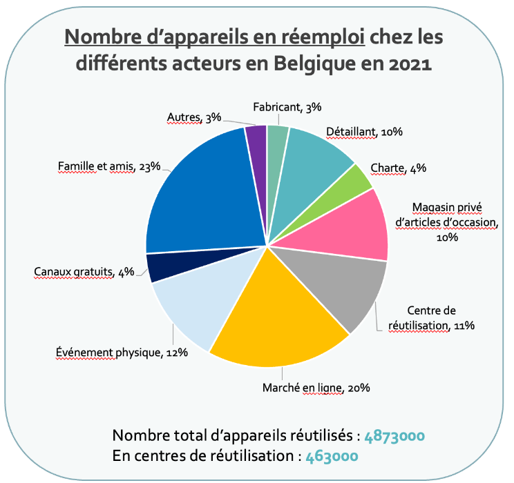 Les personnes qui vendent elles-mêmes leurs appareils usagés passent en premier lieu par des plateformes en ligne comme 2ememain.be (20 %), des événements physiques (12 %) ou des magasins d’occasion (10 %). Une autre partie des appareils usagés revient sur le marché par l’intermédiaire des détaillants (10 %), des collecteurs professionnels (4 %) ou des fabricants (3 %).