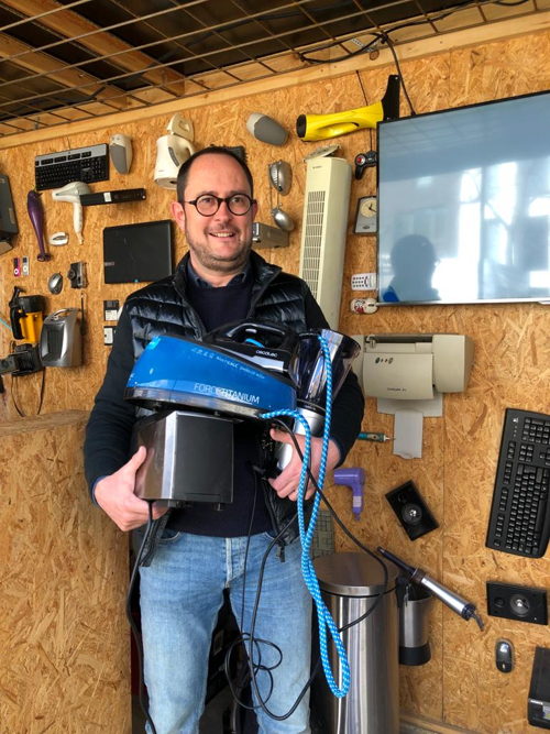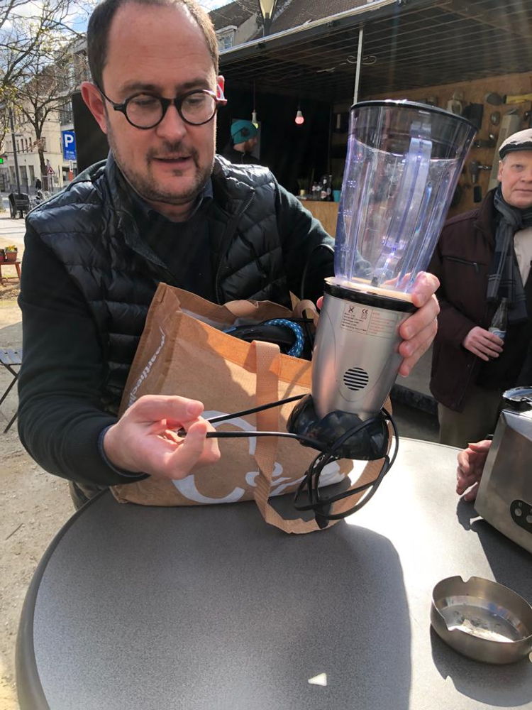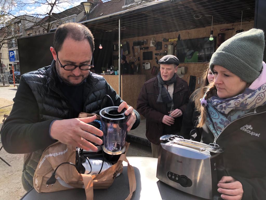 Federaal minister Vincent Van Quickenborne brengt afgedankte broodrooster, strijkijzer en blender naar Café Recupel in Kortrijk